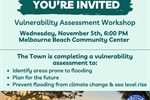 Vulnerability Assessment Workshop 05 Nov 2025 You're invited to the Town of Melbourne Beach's Vulnerability Assessment Workshop on Wednesday, November 5th, at 6:00 PM at the Melbourne Beach Community Center. The Assessment is to identify areas prone to flooding, plan for the future, and prevent flooding from climate change, sea level rise, and intense rainfall. Tagged as: , Town Boards