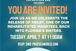 Melby's Release 07 Apr 2026 Melby - the manatee that was miraculously rescued from a stormwater pipe in February - is scheduled to be released on Tuesday, April 7th at 11:00 AM! His release will take place at Ballard Park: 924 Thomas Barbour Drive, Melbourne. The public is invited to join in this exciting culmination of Melby's recovery. Ballard Park, 924 Thomas Barbour Drive, Melbourne, FL, 32935 Tagged as: , Community events & fundraisers