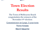 Town Election Results Published on November 05, 2025 The Town of Melbourne Beach congratulates the winners of the November 4th election for Commissioner-at-Large, 3-year term:Terry CroninSherri QuarrieThe Commissioners-Elect will be sworn in at the November 19 Regular Town Commission Meeting. Tagged as: , General Announcements
