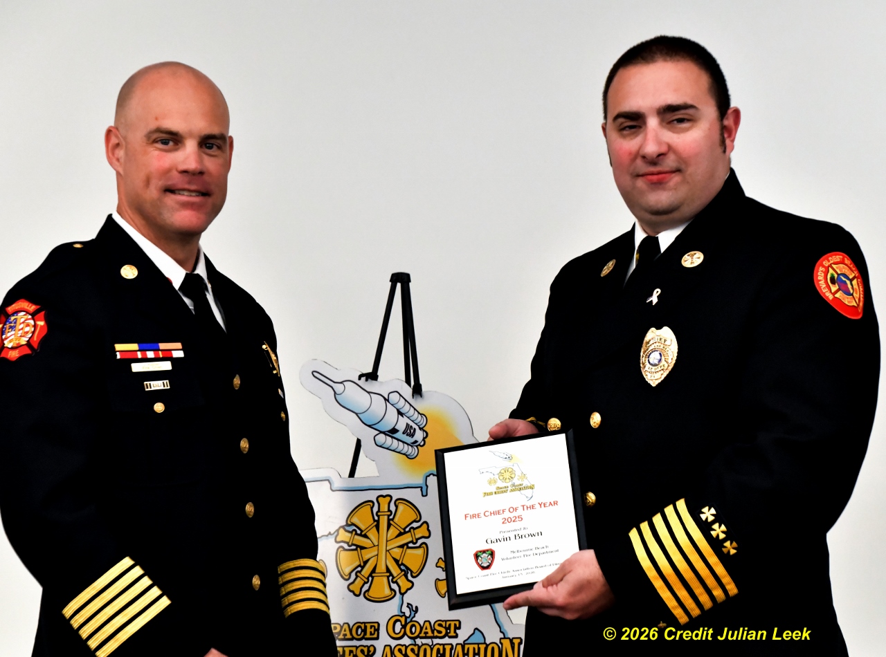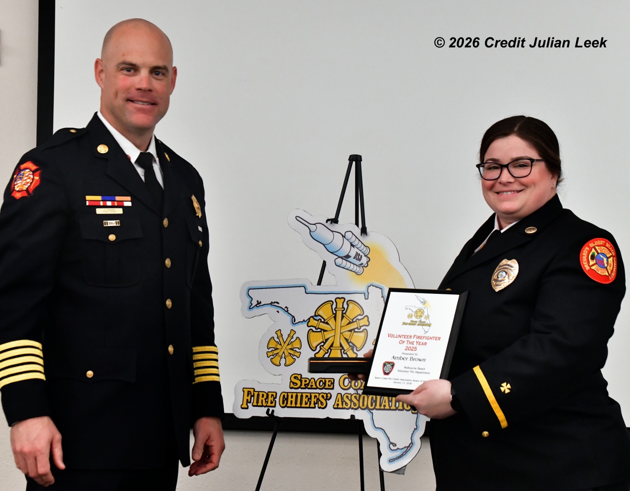 Last week, three members of the Melbourne Beach Volunteer Fire Department were recognized by the Space Coast Fire Chiefs' Association during their annual awards ceremony. Fire Chief Gavin Brown was awarded Fire Chief of the Year, Fire Chief Dave Micka (Ret.) was awarded Fire Marshal of the Year, and Lieutenant Amber Brown was awarded Volunteer Firefighter of the Year. This is the first time that MBVFD has received Fire Chief and Fire Marshal of the Year, and it is also the first time that any Space Coast volunteer fire department has received Fire Chief of the Year. This is also only the second time that a MBVFD member has received Volunteer Firefighter of the Year.